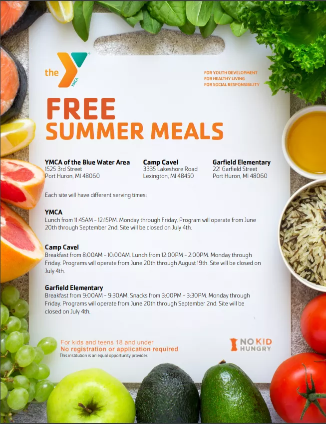 The goal of the program is to improve the diets of children and increase the opportunity for children to eat a variety of nutritious foods. The meals and snacks served meet standards established by the United States Department of Agriculture for the Child and Adult Care Food Program. For further information contact: Marika Beecherl, YMCA of the Blue Water Area, 1525 3rd Street, Port Huron, MI 48040; 810-987-6400 ext. 128